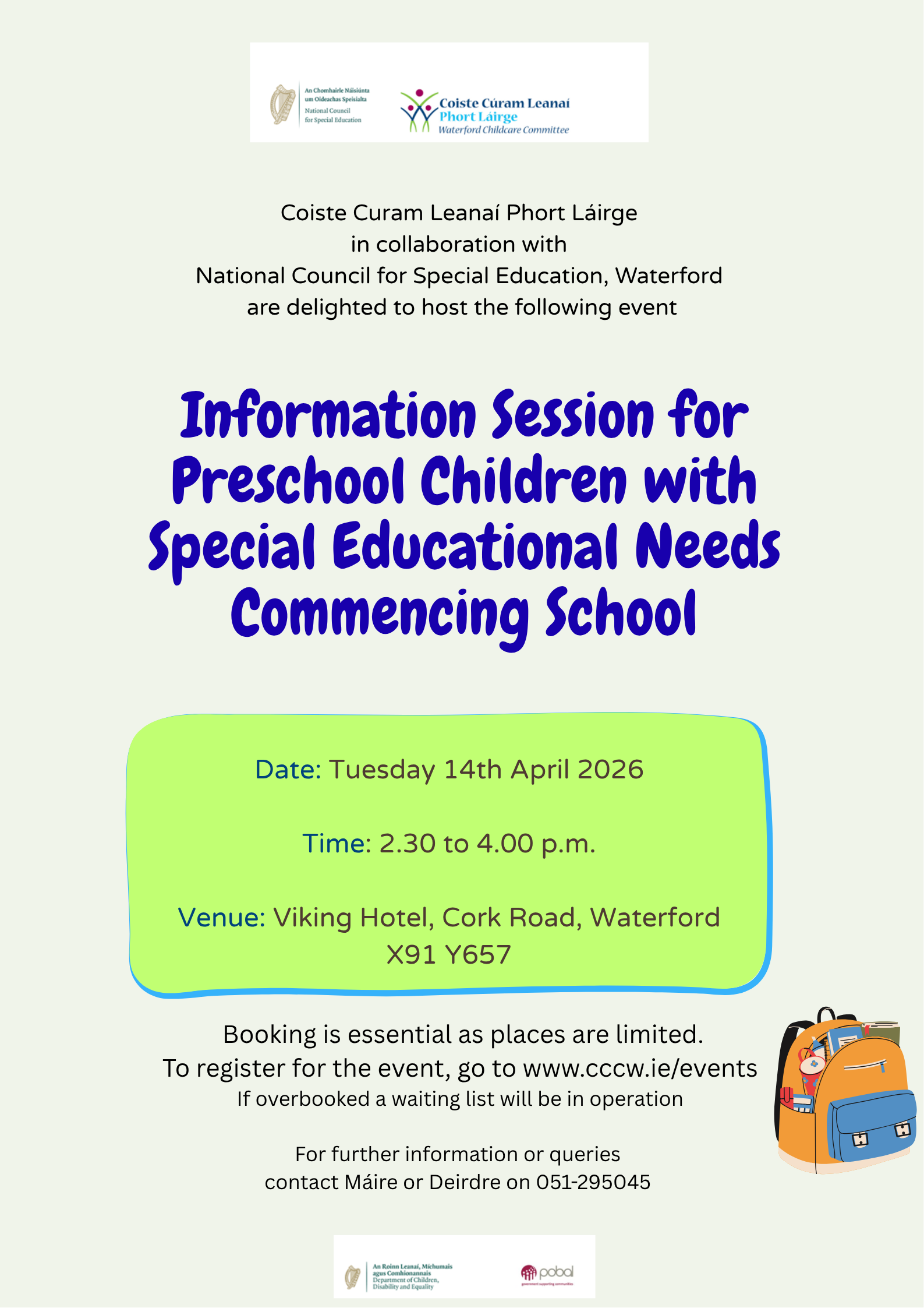 Cóiste Curam Leanaí Phort Láirge (CCLPL) is delighted to collaborate with the National Council for Special Education, Waterford Team on this event.