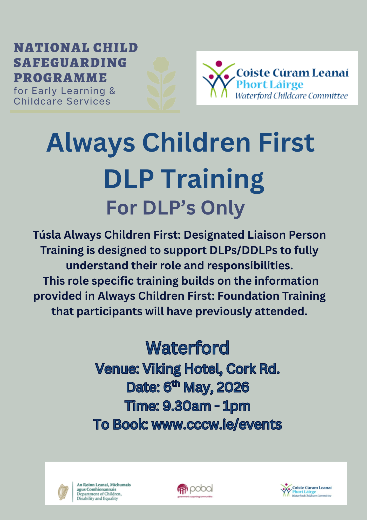 Always Children First Designated Liaison Person Training (DLP) May 6, 2026 9:30 am Viking Hotel, Cork Rd, Waterford X91 Y657 Free More