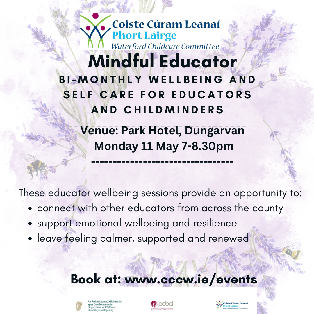 Wellbeing and Self Care for Educators and Childminders May 11, 2026 7:00 pm Park Hotel, Dungarvan, Co. Waterford. More