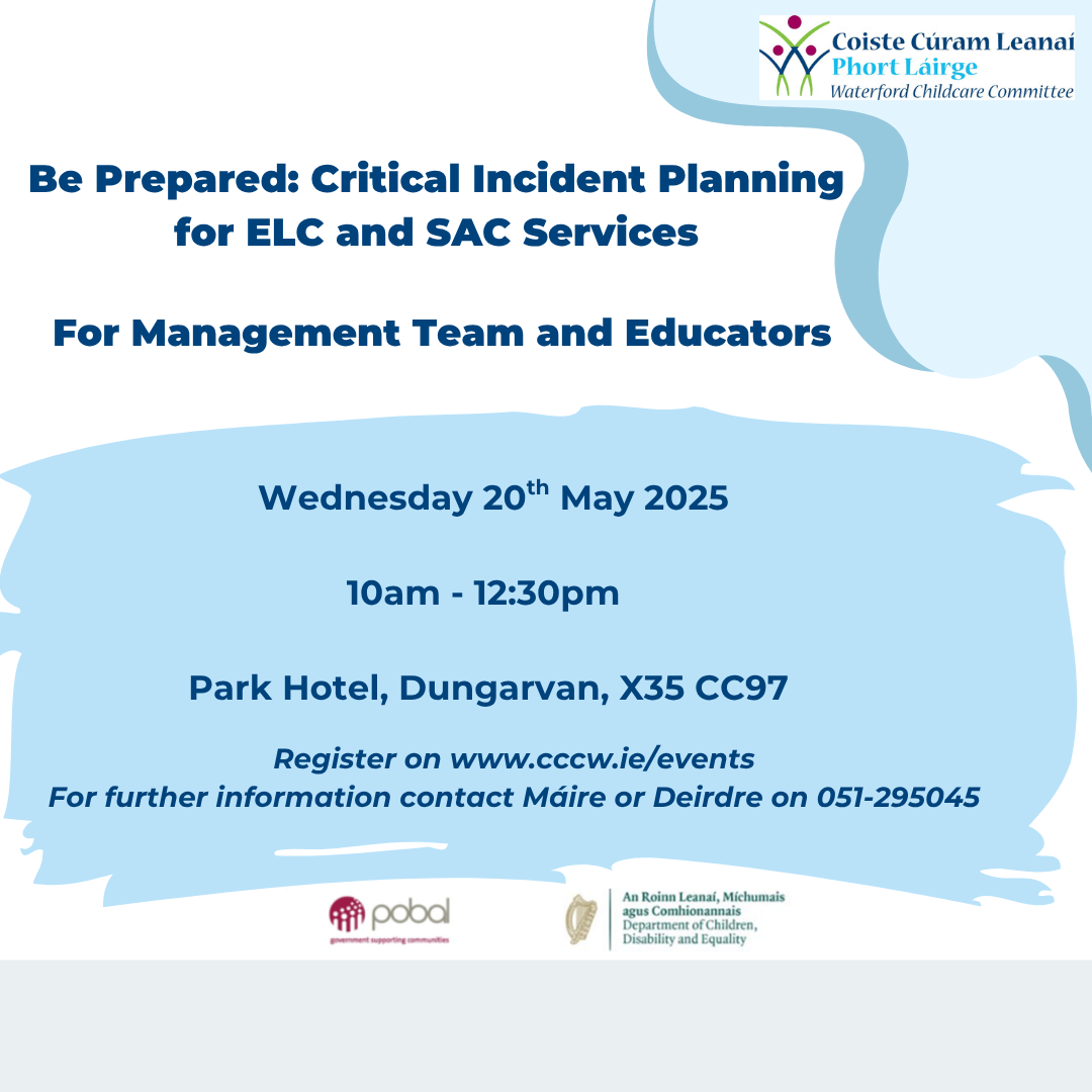 Critical Incident Planning for ELC and SAC services May 20, 2026 10:00 am Park Hotel, Dungarvan Free More