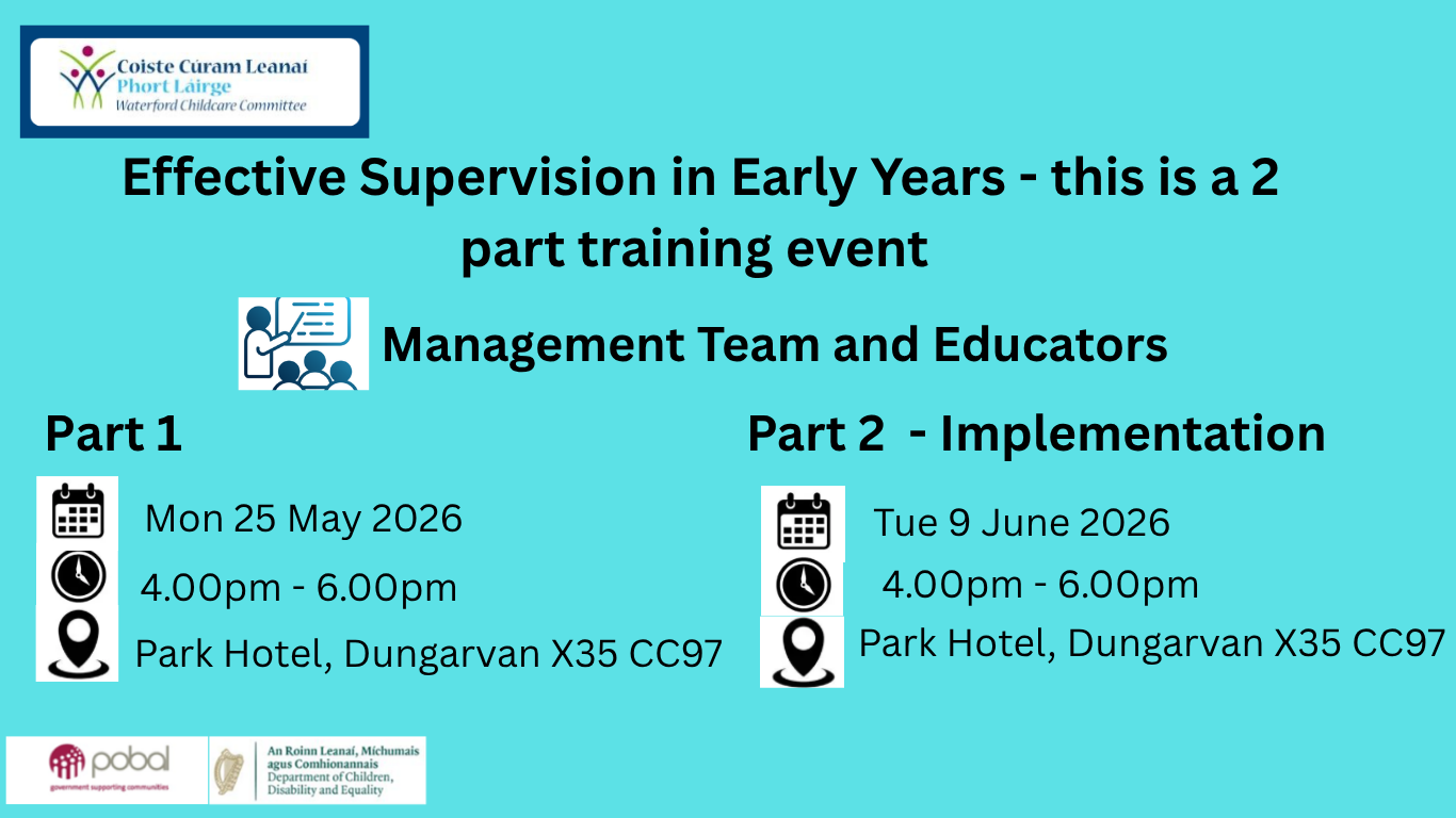 Effective Supervision in Early Years and SAC (2 Part Session Training) May 25, 2026 4:00 pm Park Hotel, Dungarvan, X35 CC97 Free Part 1 – Supervision Training Session Part 2 – Supervision Implementation Session More