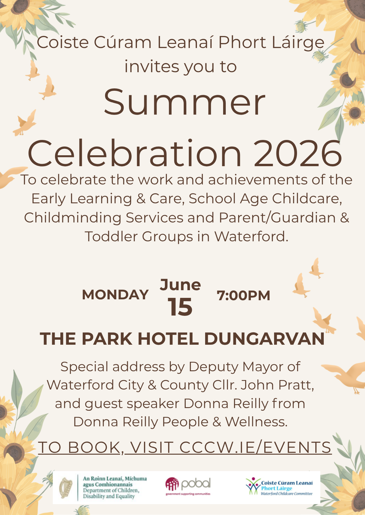 Core Funding Quality and Inclusive Practice Plan May 20, 2026 9:00 am Park Hotel, Dungarvan, Co. Waterford Its the time of year when your services QIPP End of Year Report for 2025-2026 needs completion. Coiste Curam Leanaí Phort Láirge will host More